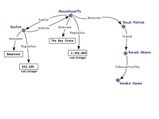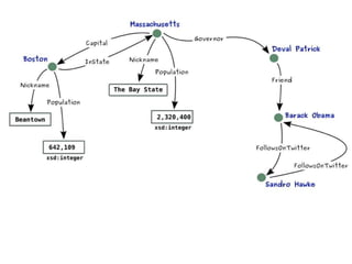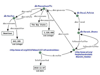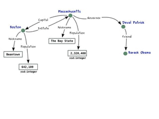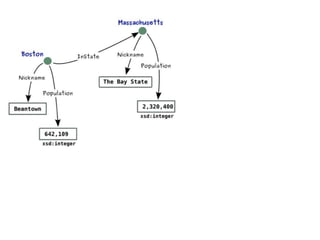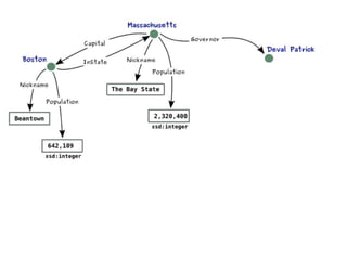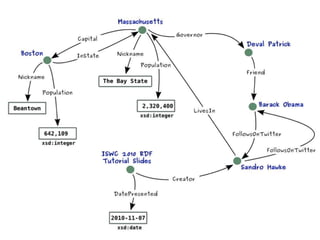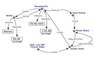 This document provides an overview of the Resource Description Framework (RDF). It begins with background information on RDF including URIs, URLs, IRIs and QNames. It then describes the RDF data model, noting that RDF is a schema-less data model featuring unambiguous identifiers and named relations between pairs of resources. It also explains that RDF graphs are sets of triples consisting of a subject, predicate and object. The document also covers RDF syntax using Turtle and literals, as well as modeling with RDF. It concludes with a brief overview of common RDF tools including Jena.