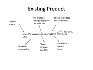 The document discusses research conducted on existing products about the effects of social media on mental health, including analyzing videos, questionnaires, and interviews. It analyzes the findings from this research and evaluates the strengths and weaknesses of each research method. The research was used to gather information needed to create a short film project about how social media impacts mental health.