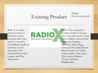 The document provides research on existing radio stations including Radio X, BBC Radio 6 Music, Virgin Radio UK, and Kerrang Radio. It then analyzes this research and discusses common features such as playing music audiences want to hear. Finally, it shares the results of a questionnaire analyzing the target audience for a new radio show.