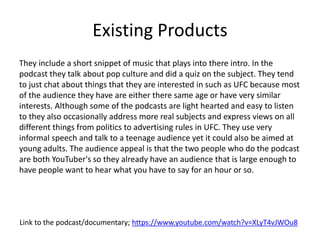 The document reviews several existing podcasts and analyzes their common features such as including a short intro jingle, bringing audiences through existing YouTube or social media followings, and taking an informal conversational format to discuss a variety of topics. It notes that keeping the content varied and discussions easy to listen to helps attract and maintain audiences. The analysis indicates the creator wants to incorporate a signature intro jingle and focus on casual conversations aimed at teenagers to match the intended audience.