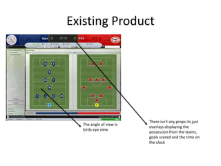 The document summarizes research on existing football simulation products and identifies key aspects to include in the author's own work. It finds that reviewed products all used a bird's-eye view of the pitch and color-coded player dots. The analysis indicates the author will adopt the top-down perspective and representation of players as dots in their own project. An audience profile section suggests the target demographic is primarily males aged 6-20 and secondarily 30-50, appealing to nostalgia and knowledge of players, with the game attracting people of any social status.