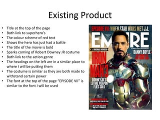 The document summarizes research on existing magazine covers. Key similarities noted across covers include featuring superheroes prominently, using red text and colors, and scattering multiple images around cover text. The analysis indicates superheroes on the front cover is a common element, and the author intends to include multiple pictures describing the magazine's content, as seen in the researched products. An audience profile outlines the target demographic as males ages 15+ interested in TV shows like The Flash, with messages about missed opportunities appealing to their sense of responsibility.