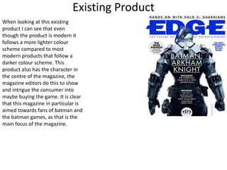 The document summarizes three existing magazine covers that were analyzed. Some common features identified across the magazines were placing the main character of the advertised game or product prominently in the center, and using color schemes that match the tone of the game or product. When developing their own magazine cover, the author intends to include these elements of a matching color scheme and central character placement.