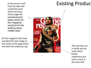 The document discusses research on existing magazine covers. It notes that successful covers typically use color contrast to catch the eye, feature a central dramatic image, and include smaller "sneak peek" images. The analysis indicates covers in the research all use contrast, dramatic shots, and sub-images. The work will apply these lessons by incorporating good contrast, a serious character image, and sneak peeks inside. It also establishes the target audience is 12-25 year olds, appealing to both genders of gamers, who respond to opportunities and impulse buys. The magazine aims to attract middle-class readers with a £4-6 price point.