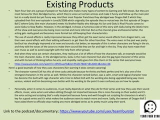 TeamFourStar creates abridged parody videos of anime shows like Dragon Ball Z on YouTube, known for their humorous takes on characters and plots while still following the overall story. Their voice acting and use of sound effects has improved over time. Other creators profiled make "what if" scenario videos that alter anime storylines or produce fantasy audio dramas with impressive sound design to immerse listeners in fictional worlds.