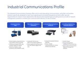 The document discusses industrial communications solutions from GE Digital Energy, including wireless and fiber optic products. Specifically, it describes MDS industrial wireless systems for data acquisition, LAN extension, and backhaul. It also discusses Lentronics fiber optic multiplexers. The document provides information on applications, features, and positioning of these products for critical infrastructure industries like energy, transportation, and heavy industrial.