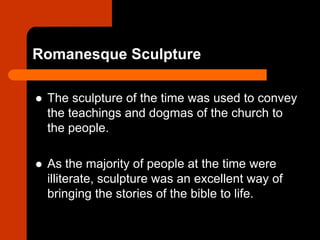 Romanesque sculpture from 1000-1200 AD served to convey religious teachings through dramatic biblical scenes. As most people were illiterate, sculpture brought stories from the bible to life in an accessible way. Figures were elongated with simplified features and exaggerated expressions to depict important theological concepts like the themes of life and death. One example is the tympanum of the Last Judgement at the Church of Saint Lazare in Autun, France, carved by Gislebertus.