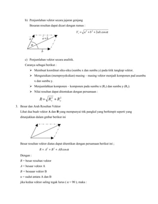 Rencana pelaksanaan pembelajaran mata pelajaran fisika ini membahas tentang penjumlahan vektor, termasuk metode grafis, jajaran genjang, dan analitis untuk menjumlahkan dua vektor atau lebih. Guru akan menjelaskan konsep-konsep tersebut dan memberikan contoh soal kepada siswa.