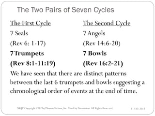 The document discusses the biblical prophecies of the end times, particularly focusing on the patterns of the 7 seals, 7 trumpets, and 7 bowls as described in Revelation. It suggests a chronological order of events, highlighting the rise of an antichrist figure, global warfare, economic control, and significant natural disasters. The analysis aims to interpret these prophetic cycles and their implications for the future, emphasizing the relation between the seals and accompanying angels.