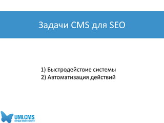 Документ обсуждает роль систем управления сайтами (CMS) в SEO-оптимизации, подчеркивая важность быстродействия и автоматизации процессов. Упоминается, что скорость загрузки страниц оказывает значительное влияние на количество просмотров и конверсию, а также представлены рекомендации по выбору CMS с функциями кэширования и автоматизации SEO. В заключение отмечается, что правильный выбор CMS может существенно ускорить продвижение сайта в поисковых системах.