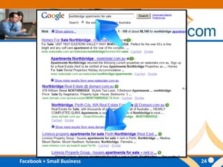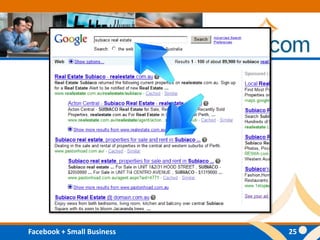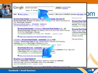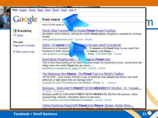 The document discusses strategies for small businesses to improve their website presence and traffic. It finds that 90% of sites are static and not optimized for search engines or user interaction. It then provides a self-audit questionnaire and scoring system to evaluate websites. The rest of the document offers tips for small businesses to build traffic to their site through search engine optimization, analytics, social media, links and other strategies. It warns against myths and "snake oil salesmen" claims about SEO and outlines tools like Google AdWords for paid search marketing.