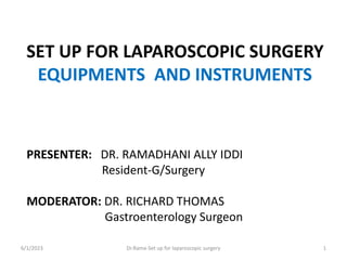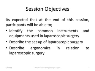 This document provides an overview of the setup for laparoscopic surgery, including the common instruments and equipment used. It discusses the key components of image production like the telescope, light source, video camera and monitors. Methods for creating pneumoperitoneum like the CO2 insufflator, Veress needle and trocars are explained. Finally, it briefly touches on gasless laparoscopy and the various operative instruments employed. The objectives are to familiarize participants with the standard laparoscopic setup and components.