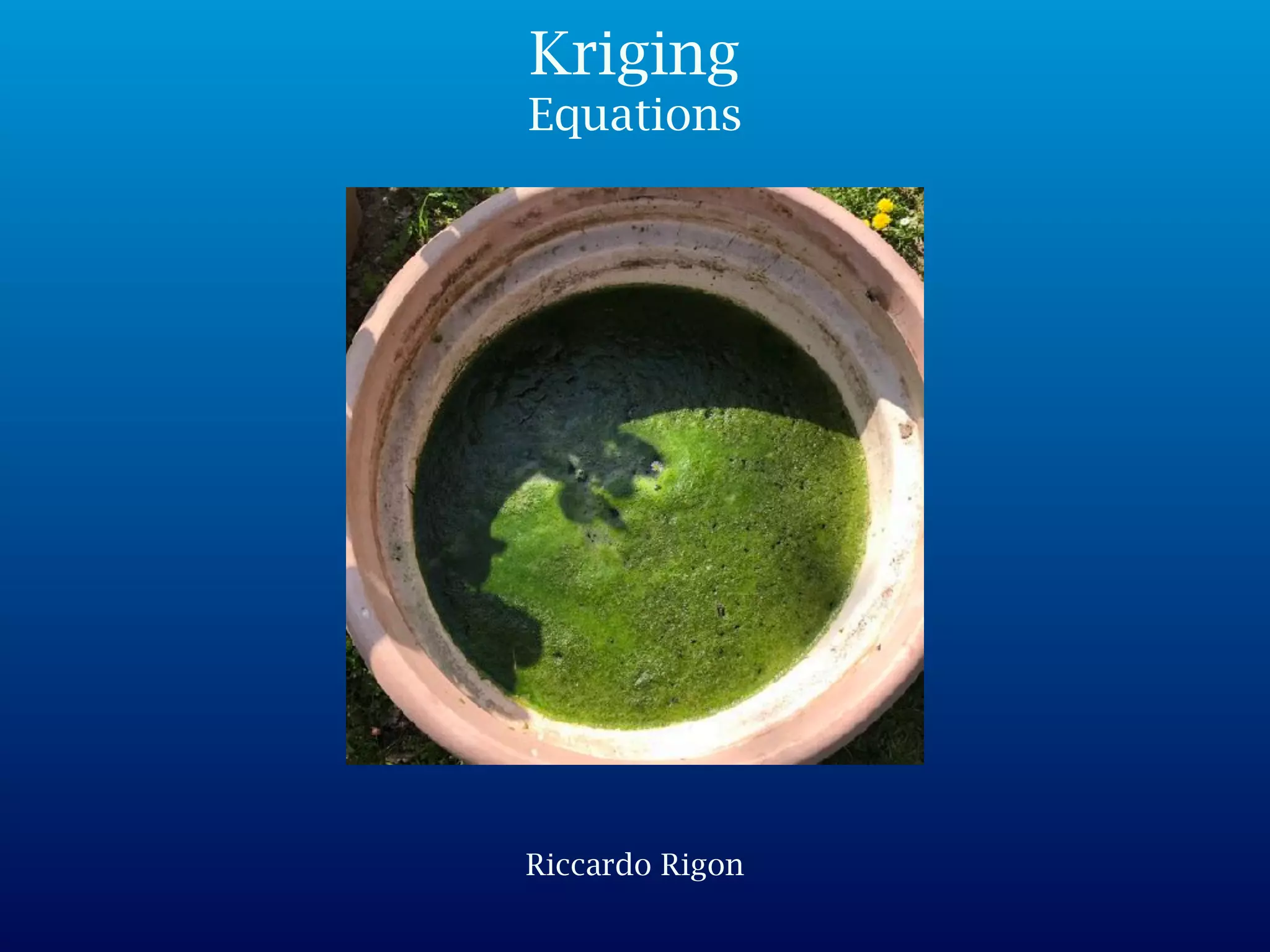 Il documento discute il kriging come metodo di interpolazione lineare per stimare grandezze a partire da dati noti. Viene sottolineato l'importanza della correttezza della stima e della minimizzazione dell'errore, con il presupposto che la media sia costante. Infine, viene presentato un sistema lineare per determinare i pesi associati alle stime.
