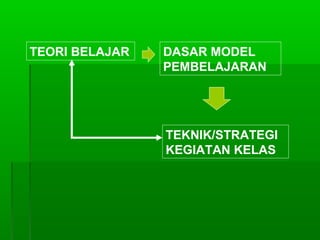 Dokumen ini membahas model pembelajaran CTL (Contextual Teaching and Learning) yang bertujuan menghubungkan pembelajaran dengan konteks kehidupan sehari-hari siswa untuk meningkatkan pemahaman dan motivasi mereka. Terdapat komponen-komponen kunci dalam CTL seperti interaksi, penilaian otentik, dan keaktifan siswa. Selain itu, dibahas juga tentang metode pembelajaran kooperatif yang mendukung kolaborasi dan pengembangan keterampilan sosial.