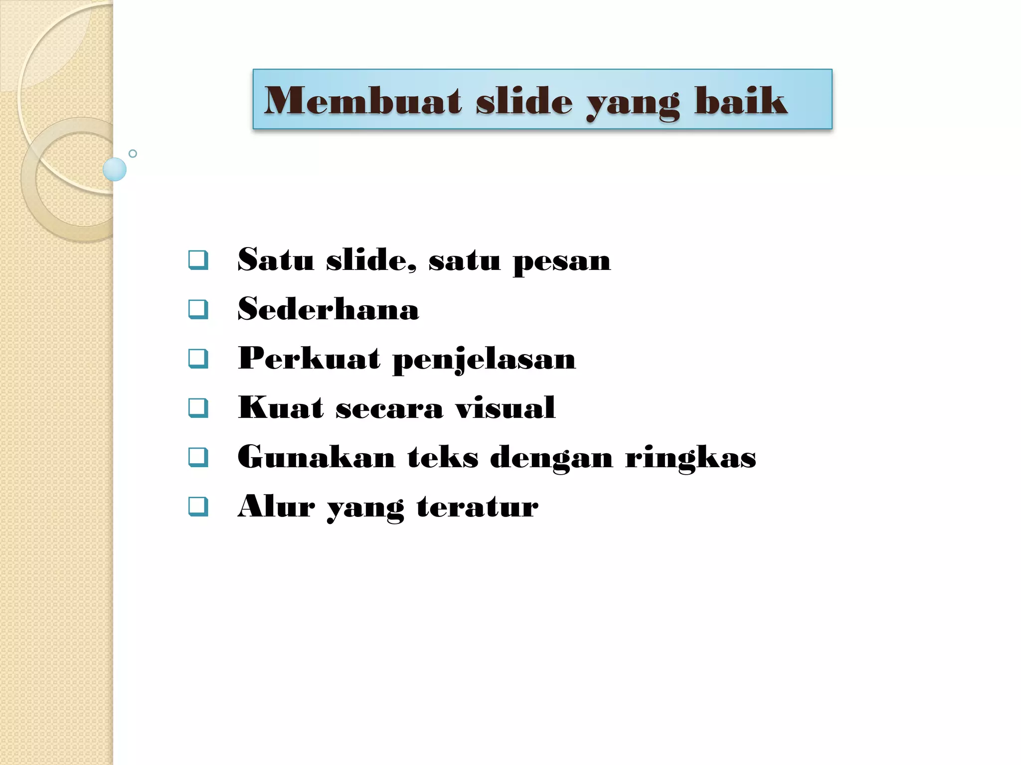 Dokumen tersebut memberikan panduan untuk membuat slide presentasi yang efektif dengan hanya satu pesan utama per slide, penjelasan sederhana, penguatan visual, dan alur yang teratur. Selanjutnya daftar fasilitas sekolah pokok seperti ruang kelas, perpustakaan, laboratorium, dan jaringan internet. Kemudian contoh perhitungan sederhana dan struktur organisasi sekolah beserta daftar nilai siswa per mata pelajaran.