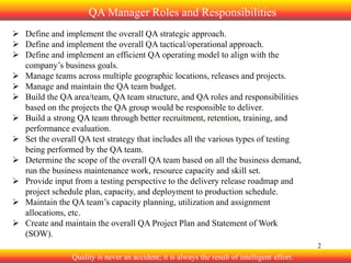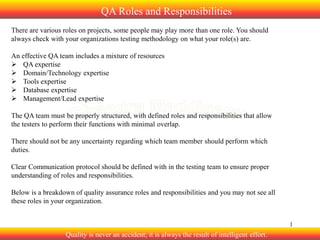The document discusses various quality assurance (QA) roles and responsibilities. It describes roles such as QA Manager, QA Team Leader, QA Test Lead, QA Analyst, QA Automation Analyst, QA Defect Coordinator, Program Manager, Project Manager, Business Analyst, Technical Lead, and Development Team. For each role, it provides a high-level overview of their key responsibilities such as creating test plans, executing tests, reporting defects, overseeing projects/programs, and collaborating with other roles. The goal is to define clear roles and responsibilities to structure the QA team effectively.