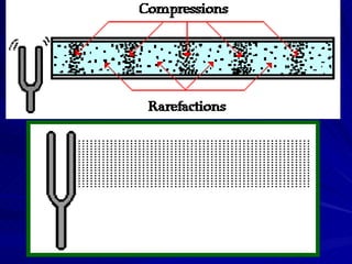 The speed of sound depends on the type and temperature of the medium, with liquids and solids conducting sound better than gases as temperature increases. Pitch is determined by frequency, with higher pitches having higher frequencies. Intensity, or loudness, increases with amplitude and is measured in decibels, with sounds like jet engines and chain saws being very loud while whispers and breathing are very quiet.