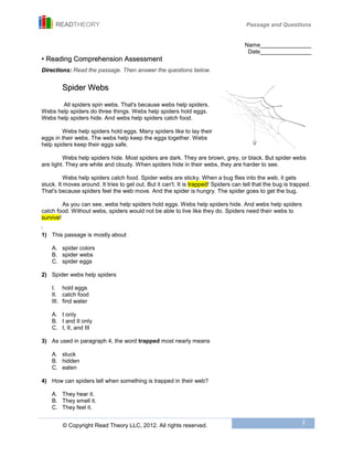 This passage discusses how spider webs help spiders in three important ways. Spider webs help spiders hold eggs together safely, help spiders hide from potential predators by providing camouflage, and help spiders catch food when insects become trapped in the sticky web. The passage emphasizes that spiders need their webs to survive because they rely on webs to reproduce, hide, and find food.