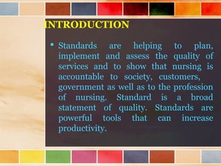 The document discusses nursing standards and their importance. Standards provide guidelines for nursing practice and help ensure quality of care. They outline what the nursing profession expects, promote best practices, and provide accountability. Standards aid in developing competencies, understanding roles, and guiding decision making. They also provide a framework for research, communication, and legal implications of practice. Standards should be realistic, attainable, clearly defined, and periodically reviewed.