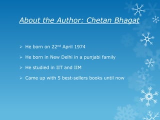 This document contains a book review of Chetan Bhagat's novel "Two States" submitted by Pratik Bhushan. It first provides background on the author, noting he was born in 1974 in New Delhi to a Punjabi family and has authored 5 best-selling books. The review then summarizes the novel as telling the story of a Tamil girl and Punjabi boy who face difficulties convincing their parents to approve of their inter-state marriage. It concludes by praising the book for its message of nationalism and emphasis on family in marriage while striking a chord with India's youth.