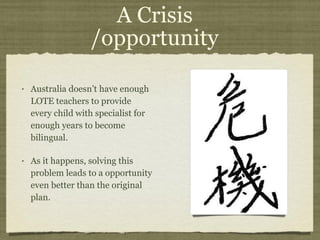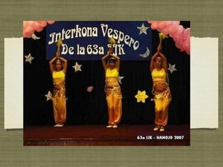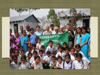 The document discusses using Esperanto as a first language for students before learning other languages like English. It proposes a 2-step process where students first learn Esperanto to gain language learning skills and then transfer those skills to a second target language. Learning Esperanto first allows more students to master a second language since Esperanto is phonetic and regular. It also helps develop important thinking skills and promotes inclusion and self-esteem in students.