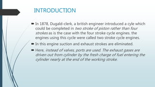 A two-stroke petrol engine completes the combustion cycle in two strokes of the piston rather than four as in a four-stroke engine. In a two-stroke engine, the intake and exhaust strokes are eliminated and ports instead of valves are used, with the exhaust gases driven out by the fresh fuel charge entering near the end of the power stroke. Everything a four-stroke engine does over two revolutions, a two-stroke engine accomplishes in one crankshaft revolution. Two-stroke engines are smaller, lighter, cheaper to produce but wear out faster and are less fuel efficient than four-stroke engines due to their greater pollution output.