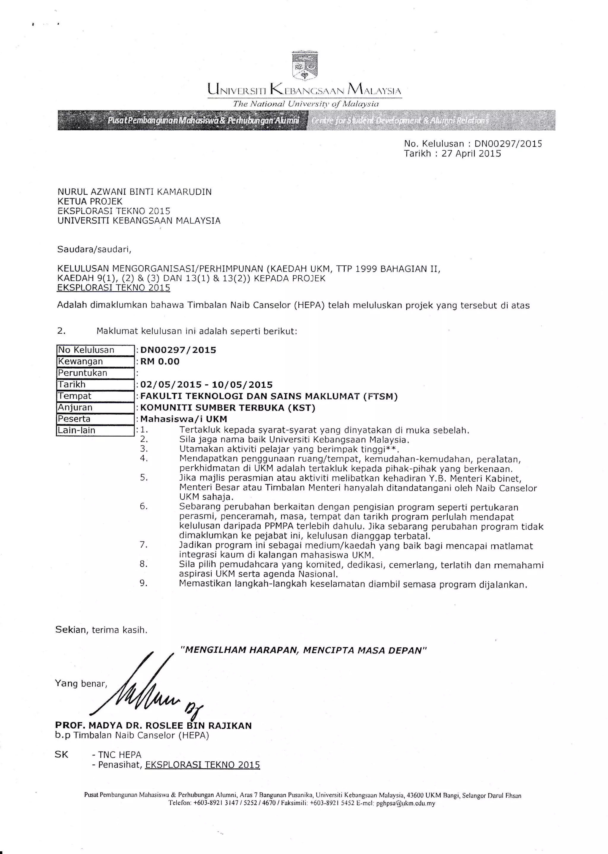 Projek eksplorasi tekno 2015 di Universiti Kebangsaan Malaysia telah diluluskan oleh Timbalan Naib Canselor (HEPA) dengan peruntukan kewangan yang ditetapkan. Terdapat syarat-syarat khusus yang perlu dipatuhi untuk memastikan kelancaran dan kejayaan program, termasuk keperluan bagi pemudahcara yang berkomitmen dan langkah-langkah keselamatan. Kesemua perubahan berkaitan program mesti mendapatkan kelulusan terlebih dahulu untuk memastikan kelulusan tetap sah.