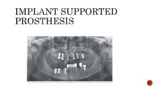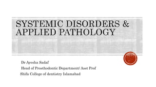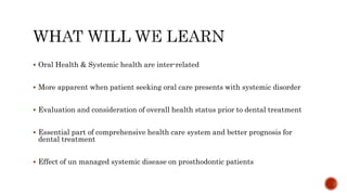 The document discusses the relationship between oral health and systemic health, noting that evaluation of a patient's overall health status is important prior to dental treatment. It then focuses on the effects of various systemic diseases on prosthodontic patients, including direct and indirect effects on oral tissues, drug interactions, immune system compromise, and sensory/motor disturbances. Specific systemic diseases that are discussed include diabetes, chronic kidney disease, anemia, leukemia, hyperthyroidism, cardiovascular disease, and dementias. Management strategies for prosthodontic treatment of patients with these conditions are provided.