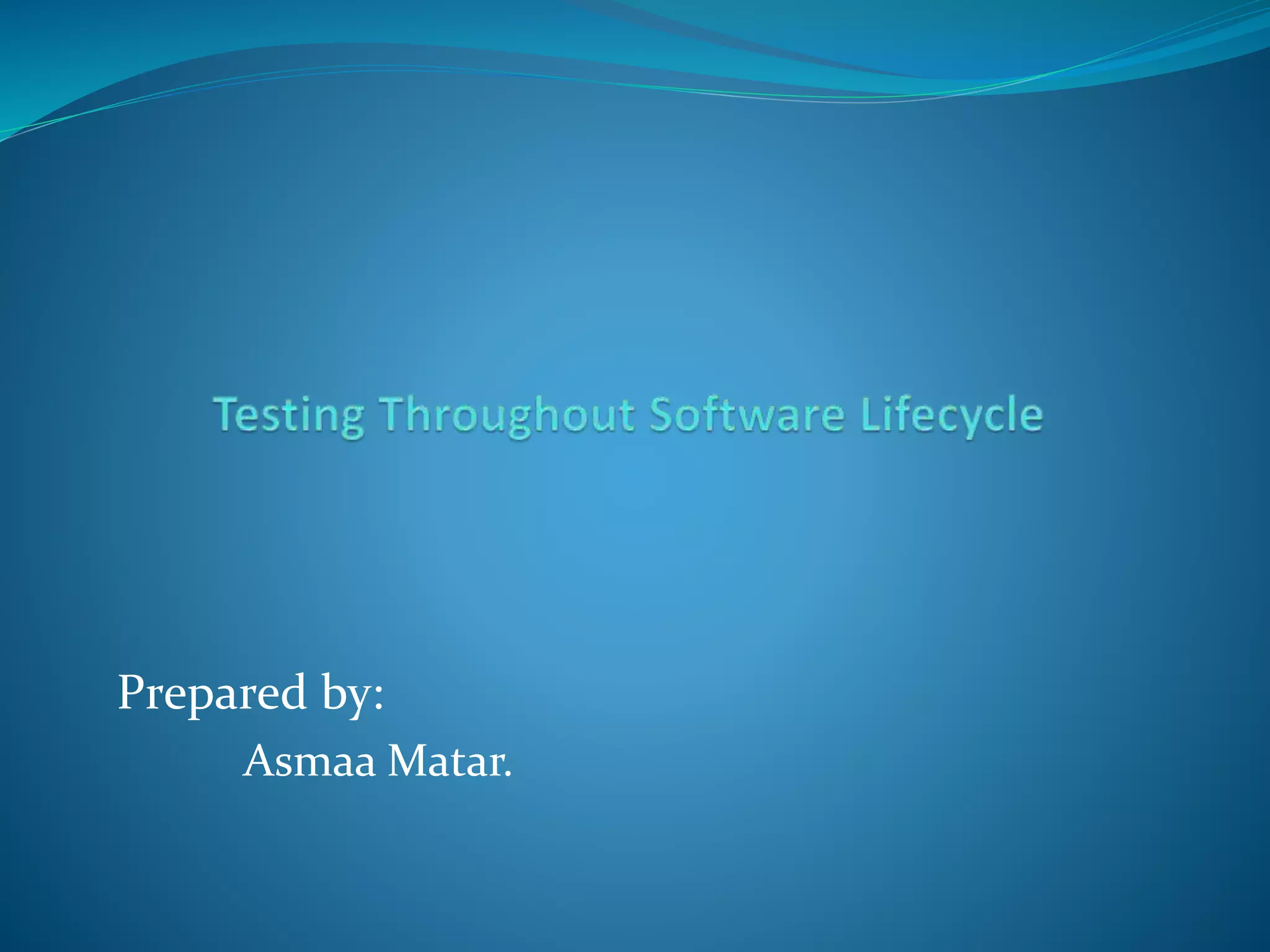 This document discusses testing throughout the software development lifecycle. It describes several common lifecycle models including waterfall, V-model, and W-model. The V-model includes four testing levels that correspond to development levels. The W-model focuses on early verification and validation. There are different types of testing at various stages including component, integration, system, and acceptance testing. Functional, non-functional, structural, and change-related testing are also discussed.