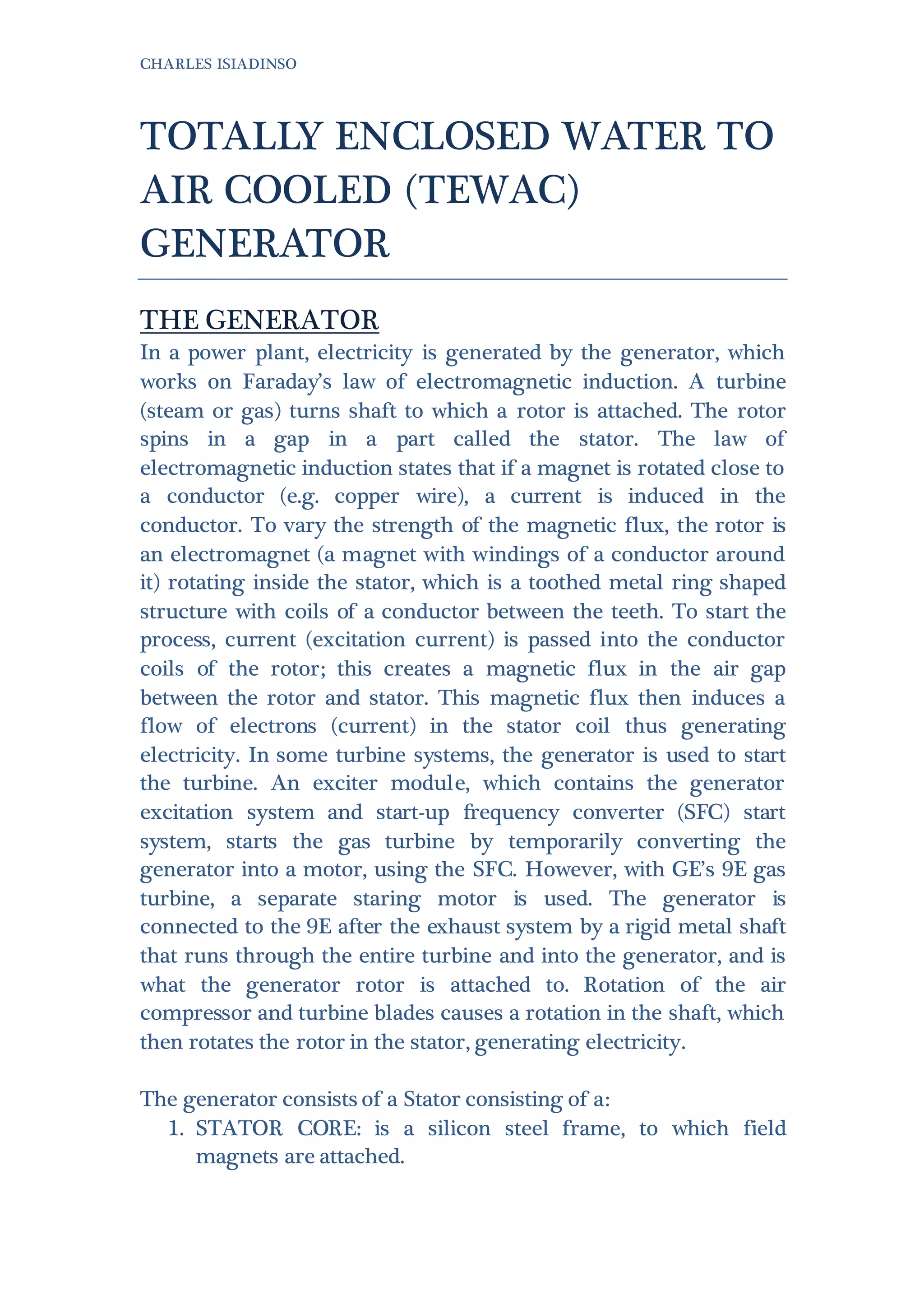 The document discusses different types of generators used in power plants, focusing on Totally Enclosed Water to Air Cooled (TEWAC) generators. TEWAC generators circulate cooled air inside the enclosed generator through air-to-water heat exchangers to cool the rotor, unlike open-ventilated generators which draw in outside air. The document also describes the basic components of generators, including the stator, rotor, and exciter, which is a separate unit that provides current to the rotor to start power generation and control output.