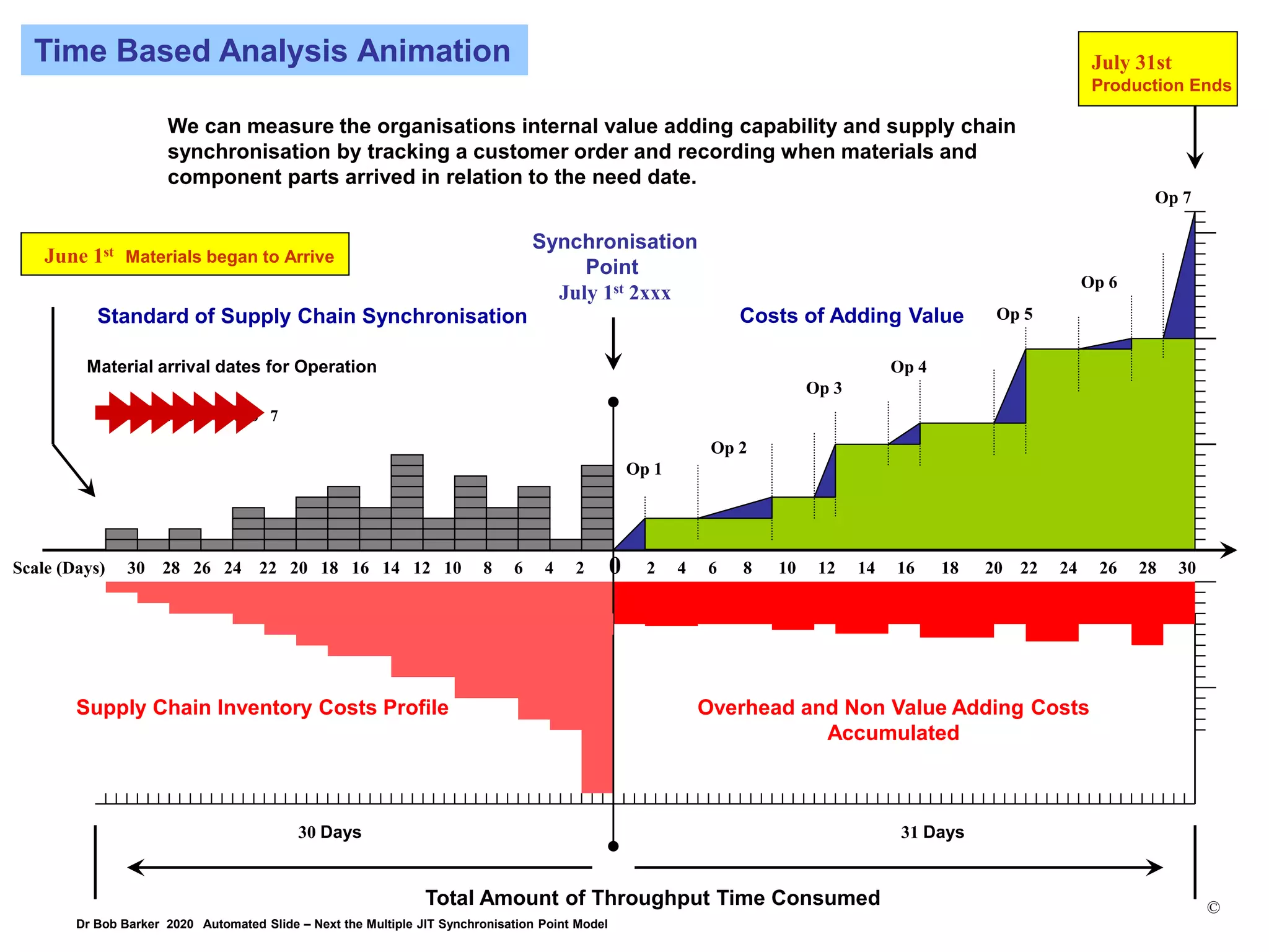 This document discusses measuring an organization's internal value-adding capability and supply chain synchronization. It proposes tracking a customer order and recording when materials and component parts arrive in relation to when they are needed. As an example, it notes that in some auto and aerospace production plants, materials began arriving on June 1st and production ended on July 31st, taking 30 days and 31 days respectively to complete.