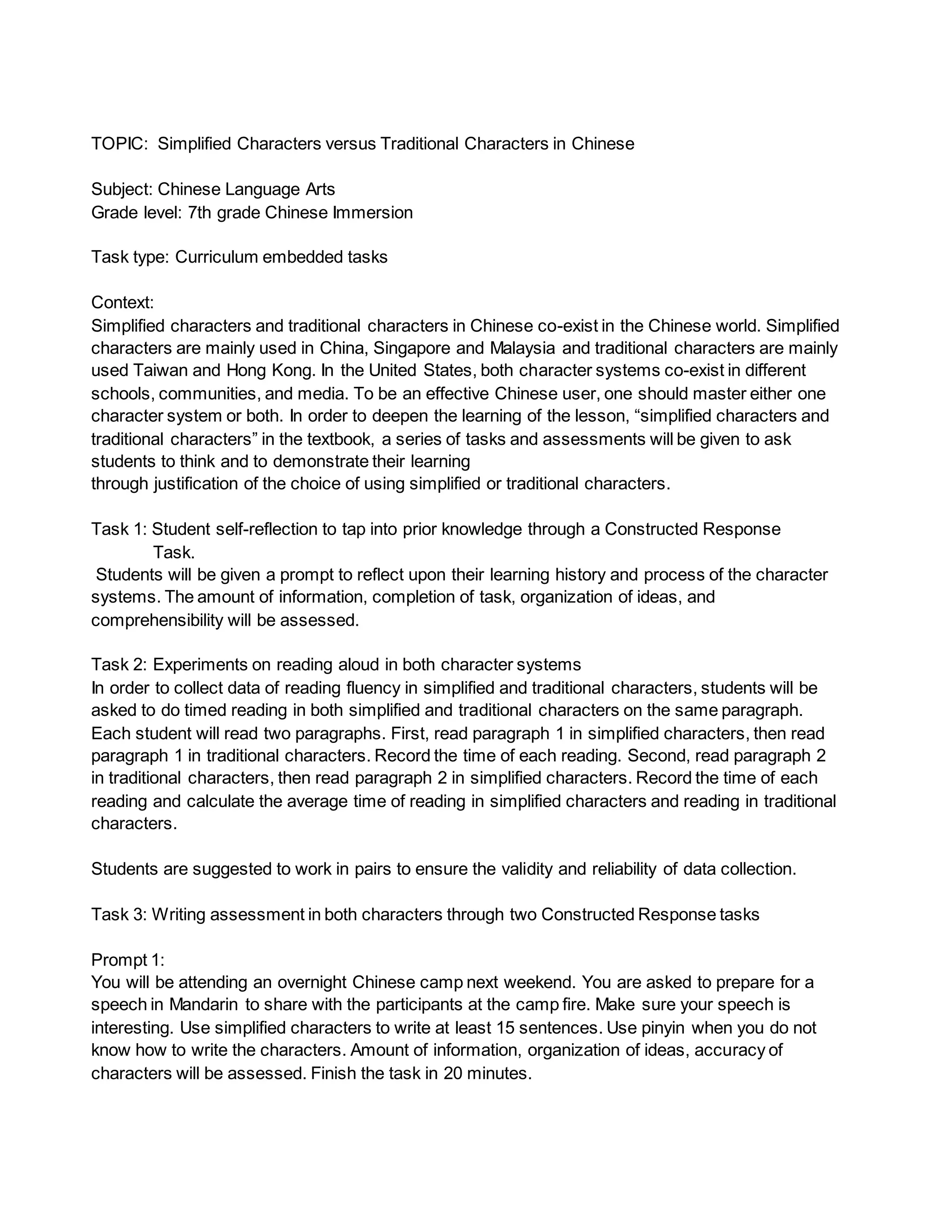 The document outlines a curriculum for 7th grade Chinese immersion focusing on simplified versus traditional characters. It includes a series of tasks and assessments designed to enhance students' understanding and proficiency in both character systems through self-reflection, reading assessments, writing tasks, and debates. Students are encouraged to reflect on their learning and make informed decisions on which character system to concentrate on based on their data and experiences.