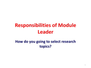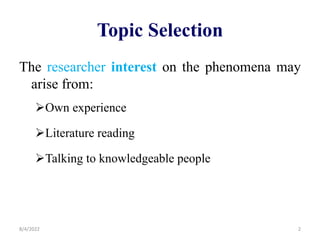 This document provides guidance on developing a research proposal, including selecting a topic, writing objectives, conducting a literature review, and referencing sources. It discusses selecting a topic based on relevance, feasibility, and other criteria. It emphasizes that objectives should be focused, ordered logically, and measurable. The literature review should synthesize prior work and identify gaps. Sources must be properly referenced following a recognized style like APA or Vancouver. Overall, the document outlines the key components and best practices for constructing a strong research proposal.