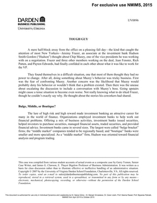 This document summarizes accounts from several employees at an investment bank about their difficult experiences working with a vice president named Chip Mazey. Mazey was known for verbally abusing and demeaning subordinates. He demanded perfection while not acknowledging his own mistakes. Several employees, including analysts, associates and support staff, describe specific instances of Mazey's inappropriate and unprofessional behavior, including public outbursts, impossible demands, personal insults and forcing people to work long hours with little notice. The document concludes with Jeremy Frazer, an associate who had been working with Mazey, gathering this information from coworkers but unsure of what, if anything, to do about Mazey's behavior.