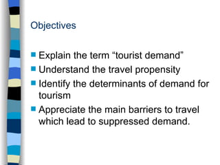The document discusses the factors that influence tourism demand. It defines tourism demand and identifies different types of demand. It then outlines several key determinants of tourism demand, including economic development factors, population factors, lifestyle determinants, and lifecycle determinants. Some of the main barriers to travel that can suppress demand are also identified, such as the expense of travel, lack of time, physical limitations, family circumstances, and lack of interest.