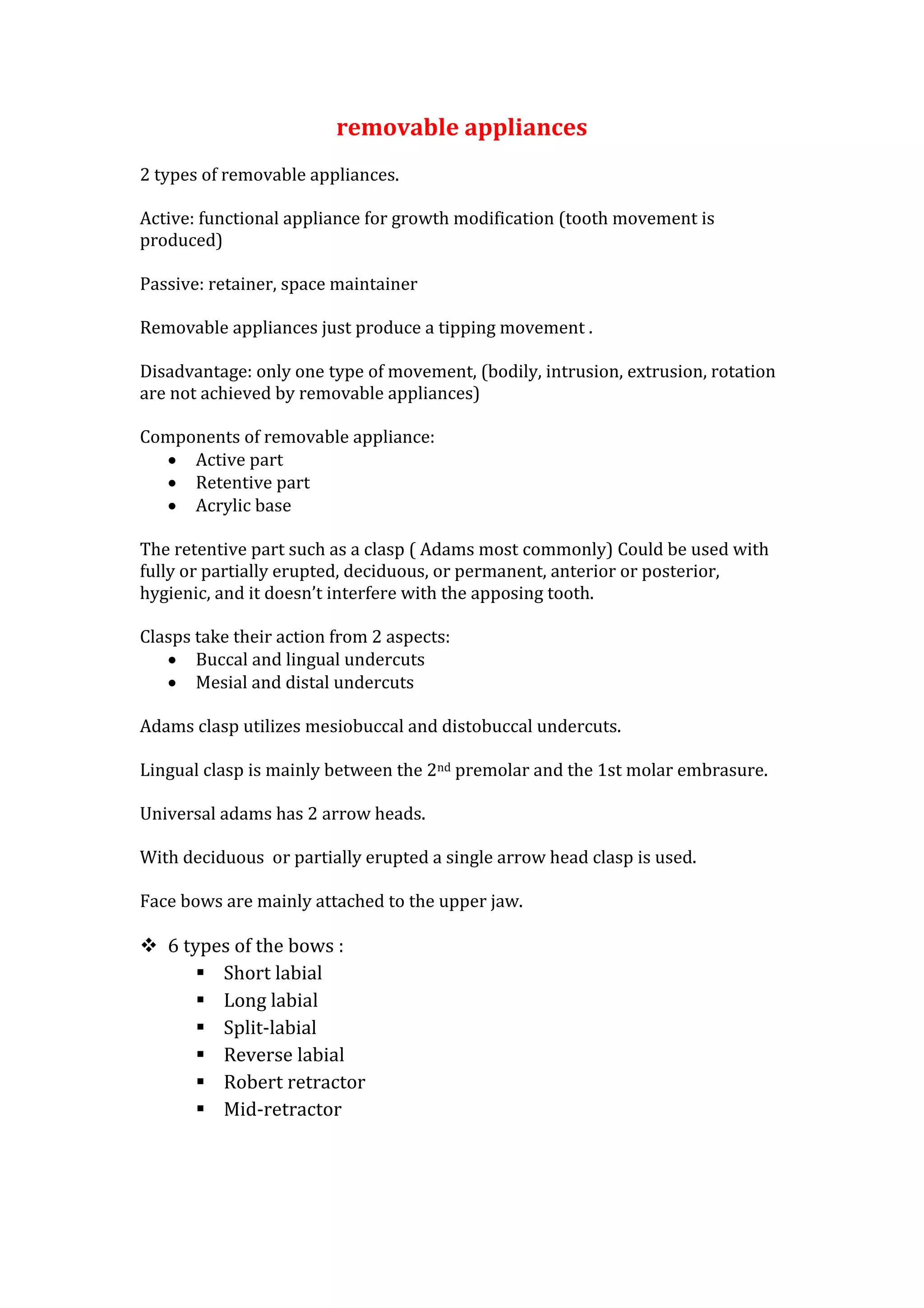 There are two types of removable appliances - active appliances used for tooth movement and passive retainers or space maintainers. Removable appliances only produce tipping movements of teeth and cannot achieve other movements like bodily, intrusion, or rotation. Components include an active part to move teeth, retentive parts like Adams clasps using undercuts, and an acrylic base. Common facebows attached to the upper jaw include short and long labial bows, split labial bows, and Robert retractors. Removable expanders can expand the dental arch up to 1.5-2 mm per side while fixed expanders can achieve up to 11 mm of expansion.