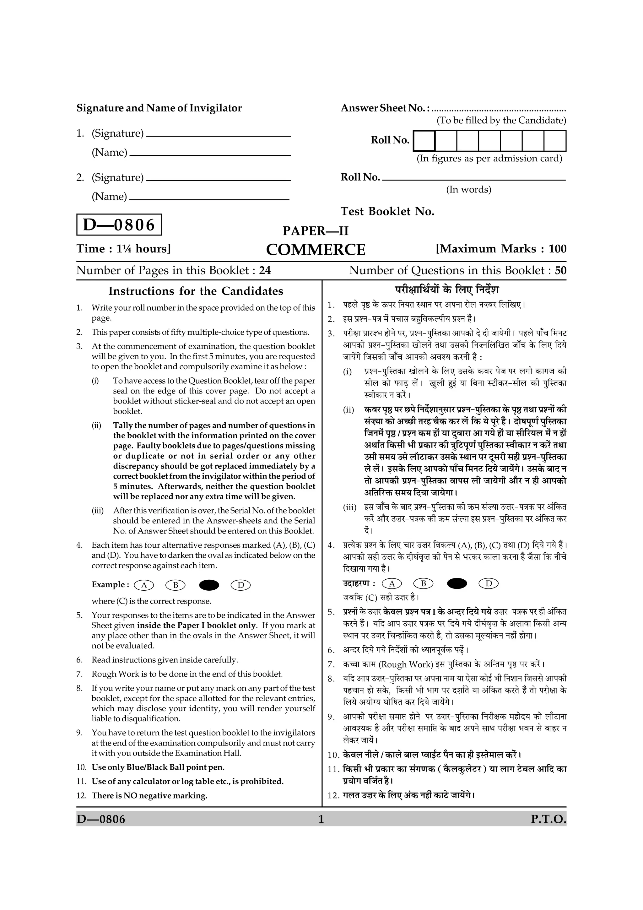 The document is an examination paper for Commerce Paper II containing 50 multiple-choice questions, each carrying 2 marks, with clear instructions on how candidates should attempt the test. It includes guidelines on verifying the question booklet, marking answers, and prohibited actions during the examination. Candidates are required to return the booklet after completion and must adhere to specific formatting rules for their answers.