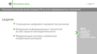 Документ описывает концепцию региональной информатизации в России, акцентируя внимание на сокращении цифрового неравенства и повышении качества жизни граждан через внедрение информационных технологий. Основные задачи включают модернизацию системы управления, финансирование и развитие инфраструктуры для предоставления государственных услуг. В итоге, предлагаются меры по улучшению информатизации и обучению в различных отраслях, с целью достижения ключевых показателей развития информационного общества в регионах.