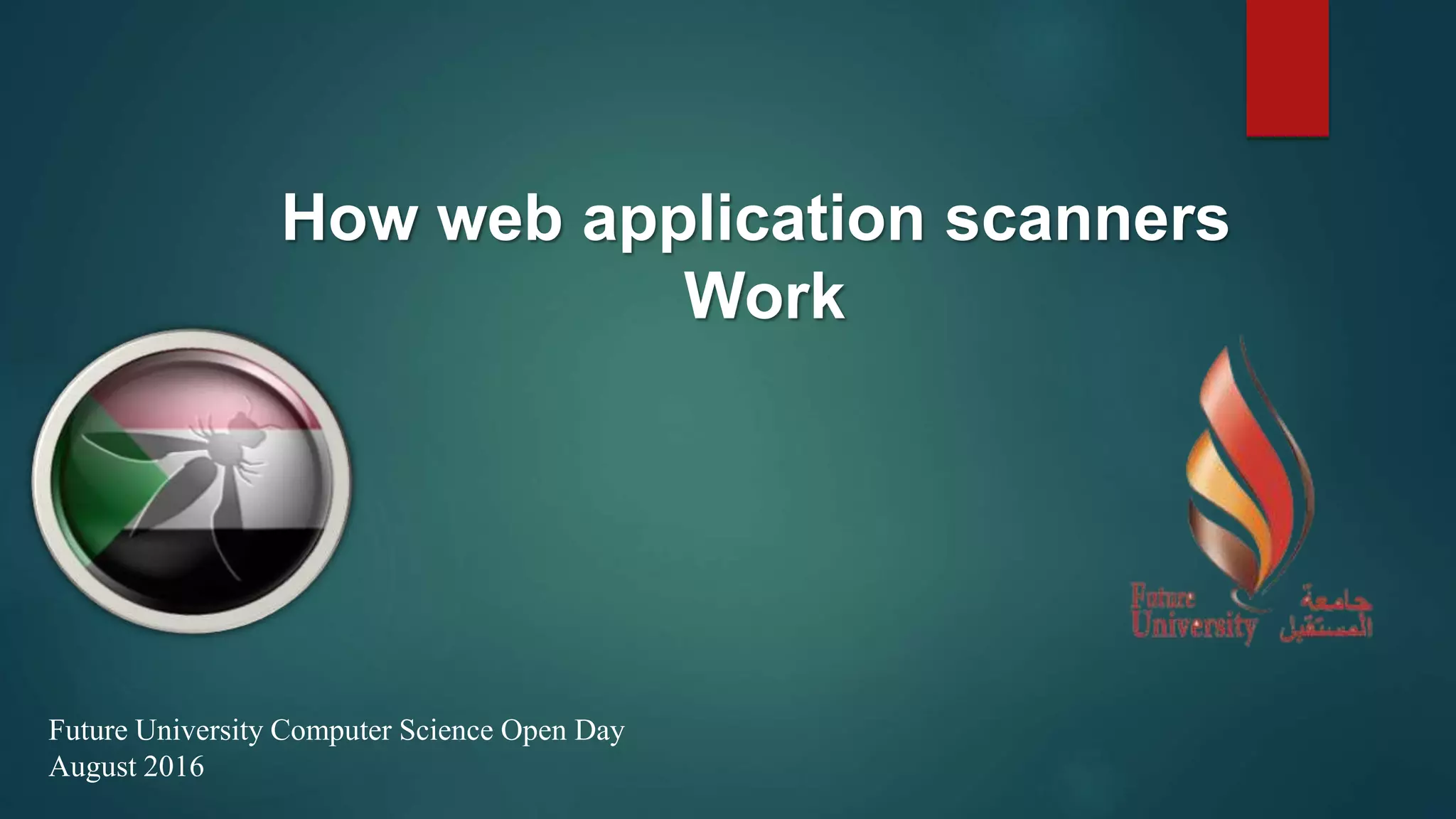 Web application scanners crawl a web application to locate vulnerabilities by simulating attacks. They work by supporting various protocols, crawling and parsing content, testing for vulnerabilities, and generating reports. While scanners help find issues, developers should focus on learning secure coding practices to build applications securely from the start.