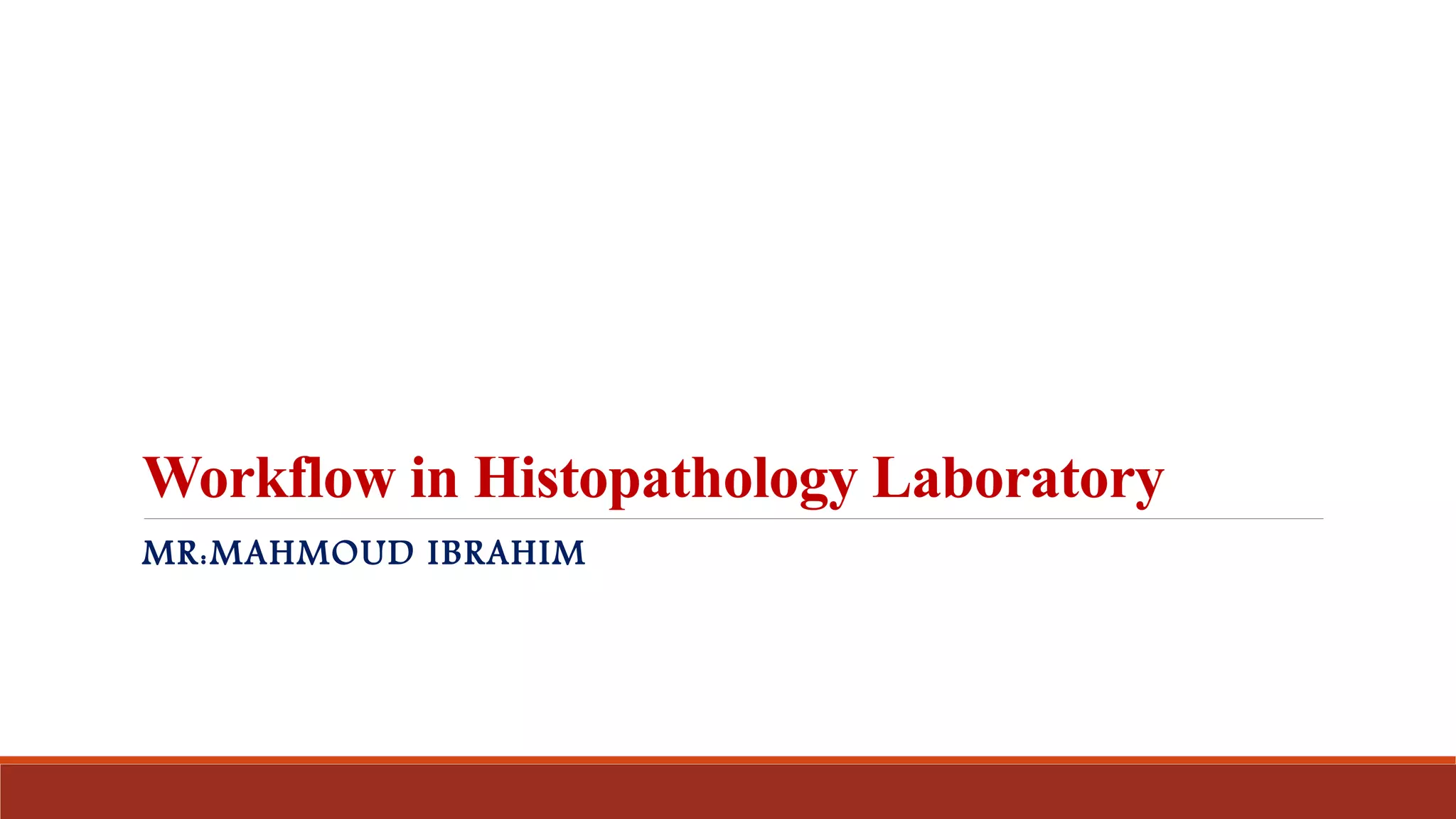 The document describes the key steps in the histopathology laboratory workflow. Specimens are received and labeled with patient information. In grossing, samples are selected and inspected. Tissue processing involves dehydration, clearing, impregnation and embedding to prepare samples for microtomy, where thin sections are cut. Sections are stained, usually with H&E, and examined microscopically. Preparation methods include fresh cells/tissues, smears and sectional techniques, with sectional being the standard method used in histopathology.