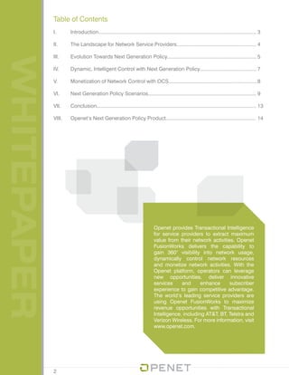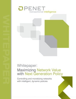 The document is a whitepaper about using next generation policy management to maximize network value for network service providers. It discusses how next generation policy allows for dynamic, intelligent control over subscriber network usage and resources through subscriber-aware policies. It also discusses how next generation policy can be integrated with online charging systems to enable new monetization opportunities for service providers through real-time charging capabilities. Examples provided show how next generation policy allows for enforcing fair usage policies, tiered service controls based on various attributes, and upselling opportunities when usage thresholds are reached.