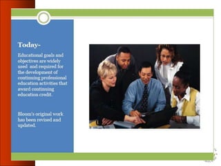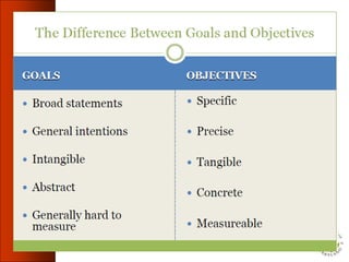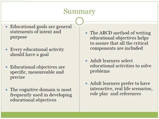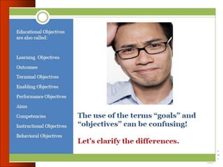 This document discusses learning objectives and their importance in education. It defines key terms like goals, objectives, instructional objectives and learning objectives. It emphasizes that objectives should be learner-centered and measurable. The document outlines the components of a well-written learning objective, including the audience or learner, the observable behavior, the conditions of performance, and criteria for acceptable demonstration of the behavior. It provides examples of learning objectives written according to these components and guidelines. The document stresses that learning objectives are essential for guiding curriculum development, instructional methods, and student assessment.