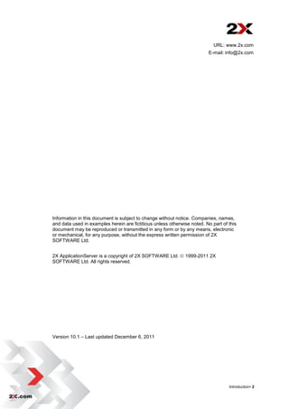 2X ApplicationServer is a software that provides virtual desktops and applications that can be accessed from anywhere. It allows publishing full desktops and applications within a virtual environment to improve manageability, security, and performance. The document provides instructions on installing 2X ApplicationServer, configuring its console, adding servers and hosts to the farm, publishing applications and desktops, and setting up load balancing, printing, scanning and other features.