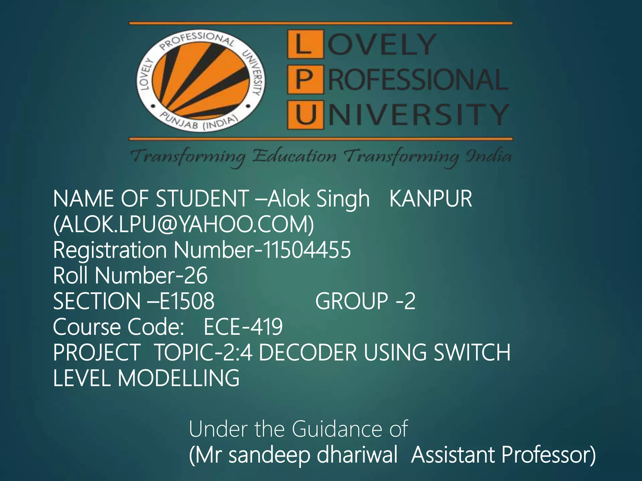 This document describes a student project to design a 2-to-4 decoder using switch level modeling in Verilog. It includes the student's name and registration details, an overview of switch level modeling, descriptions of basic logic gates like NOT, NAND using PMOS and NMOS transistors, the structure of a decoder, a block diagram and truth table for the decoder design, the Verilog code for the decoder module using basic gates, and a test bench module to simulate the decoder.