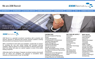 2XM Recruit is a specialist recruitment consultancy that is part of a privately owned integrated engineering and services group approaching $170 million in turnover. They offer recruitment services across multiple sectors including automotive, technology, building services, general engineering, construction, defence, rail, and turnkey projects. They pride themselves on consultative, proactive recruitment solutions that benefit both clients and candidates through their network of over 500 employees globally.