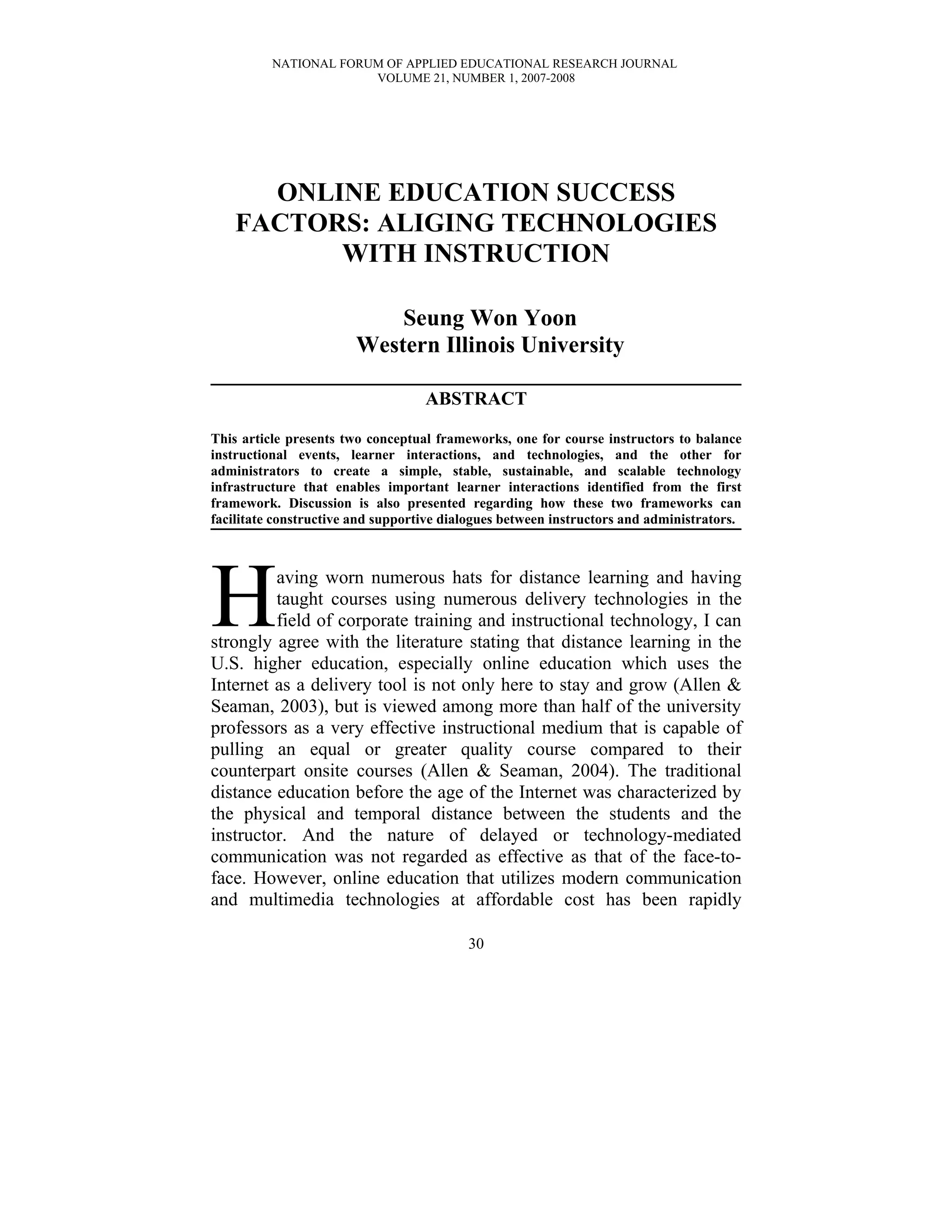 This document summarizes an article that proposes two frameworks for online education success. The first framework is for course instructors to balance instructional events, learner interactions, and technologies. The second framework is for administrators to create a simple, stable, sustainable, and scalable technology infrastructure that enables important learner interactions. The frameworks are intended to facilitate constructive dialogues between instructors and administrators regarding technology-related decisions and support for online courses.