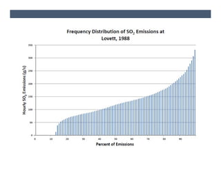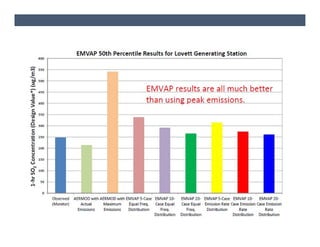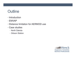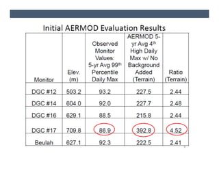 The document presents air dispersion modeling highlights shared during the 2012 A&WMA UMS Board Meeting, focusing on the use of models like AERMOD for predicting air quality and its limitations. It discusses various case studies, including air quality assessments in North Dakota and the Gibson generating station, emphasizing modeling challenges and the importance of accurate emission variability processing. The findings indicate significant variability in modeled results based on emission rates and the appropriateness of distance limitations in dispersion models.