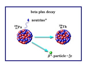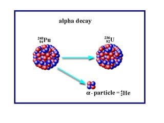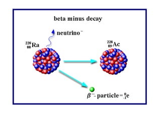 Radioactivity occurs when the nuclei of unstable atoms decay and emit radiation. There are three main types of radiation: alpha, beta, and gamma. Alpha particles consist of two protons and two neutrons, beta particles are electrons or positrons, and gamma radiation consists of electromagnetic waves. The rate of radioactive decay is random, but the half-life of a radioactive isotope is the time it takes for half the nuclei in a sample to decay. Radioactivity has industrial applications and background radiation comes from natural and man-made sources.