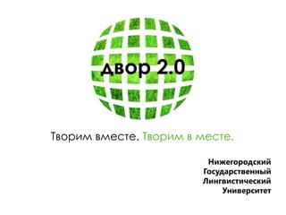 Документ описывает проект по благоустройству дворика Нижегородского государственного лингвистического университета, включая план действий по закупке материалов, налаживанию контактов и формированию групп волонтеров. Основные элементы проекта включают установку велопарковки, спортплощадки и установку интерактивной доски. Бюджет проекта составляет 76 589 рублей.
