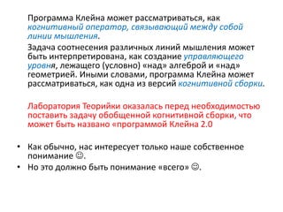 Документ рассматривает программу Клейна как когнитивный оператор, который соединяет различные линии мышления и создает управляющий уровень между алгеброй и геометрией. Исследуются мета-онтологии, парадоксы и эволюция знаний, а также способы их применения в различных контекстах, включая философию, теологию и науку. Основное внимание уделяется задаче обобщенной когнитивной сборки и методам работы с разнородными материалами.
